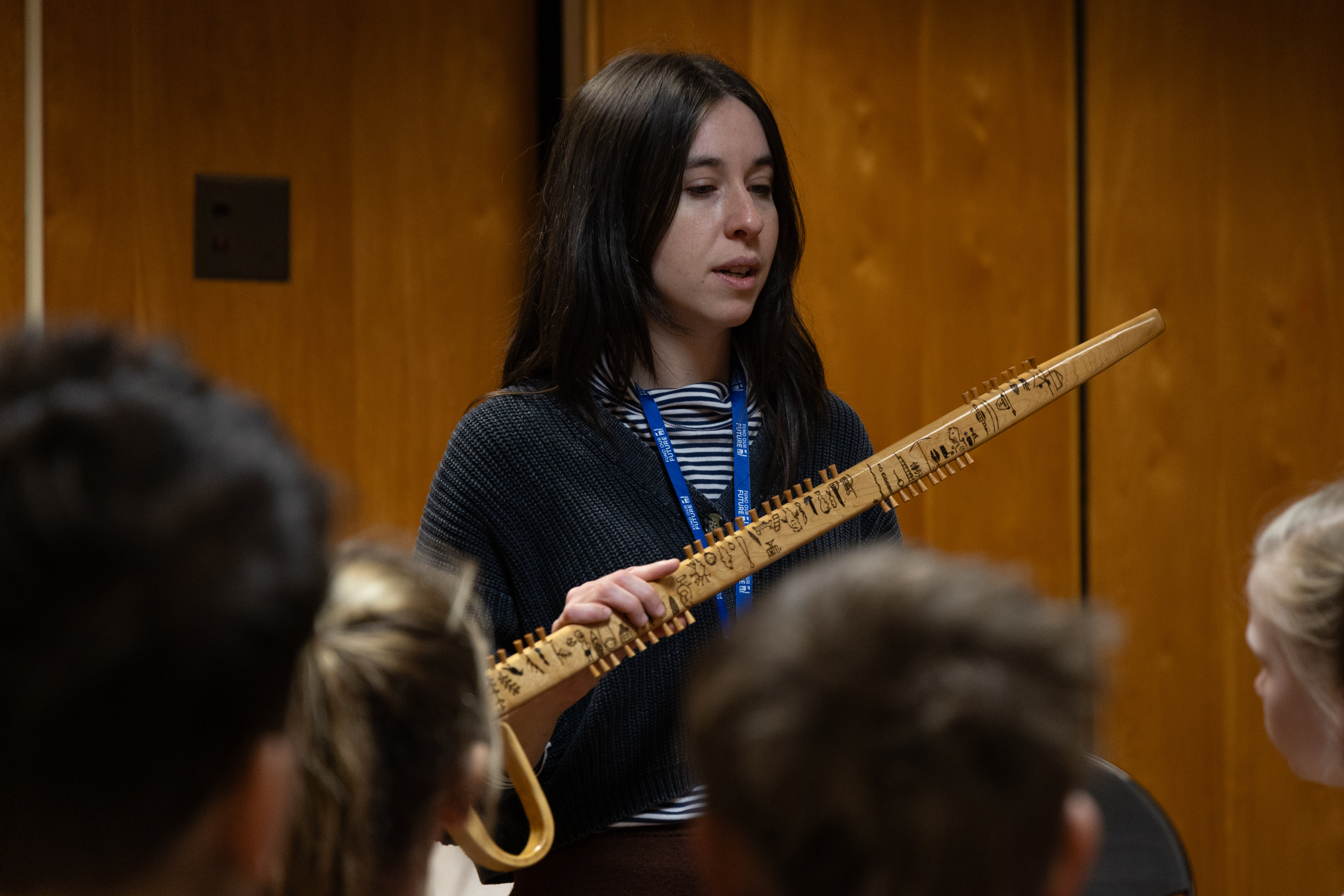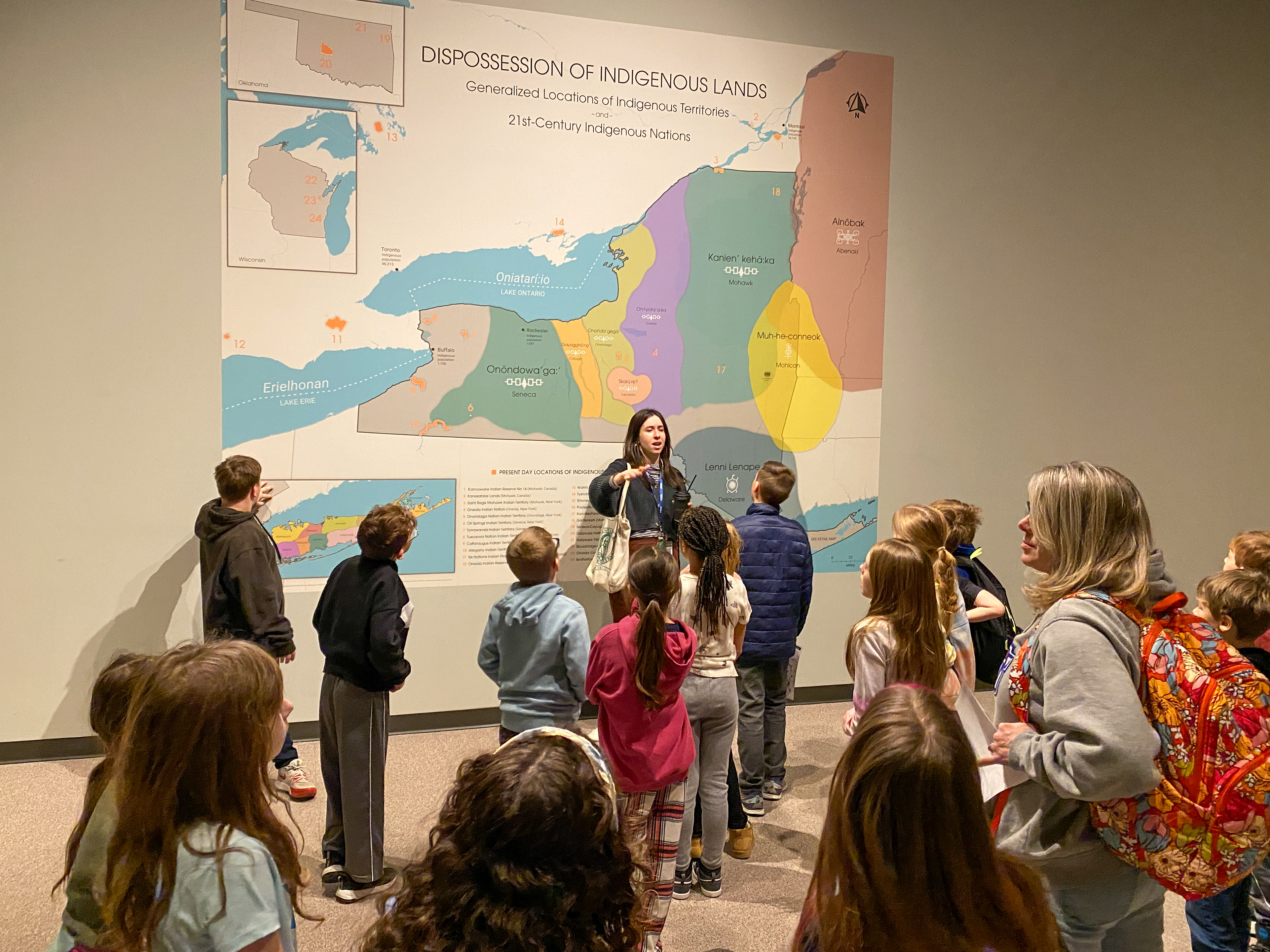 After touring a replica Haudenosaunee longhouse, students gathered around a large-scale map to discuss the history of Indigenous lands and had the opportunity to handle authentic materials, including feathers, tools, and animal pelts.