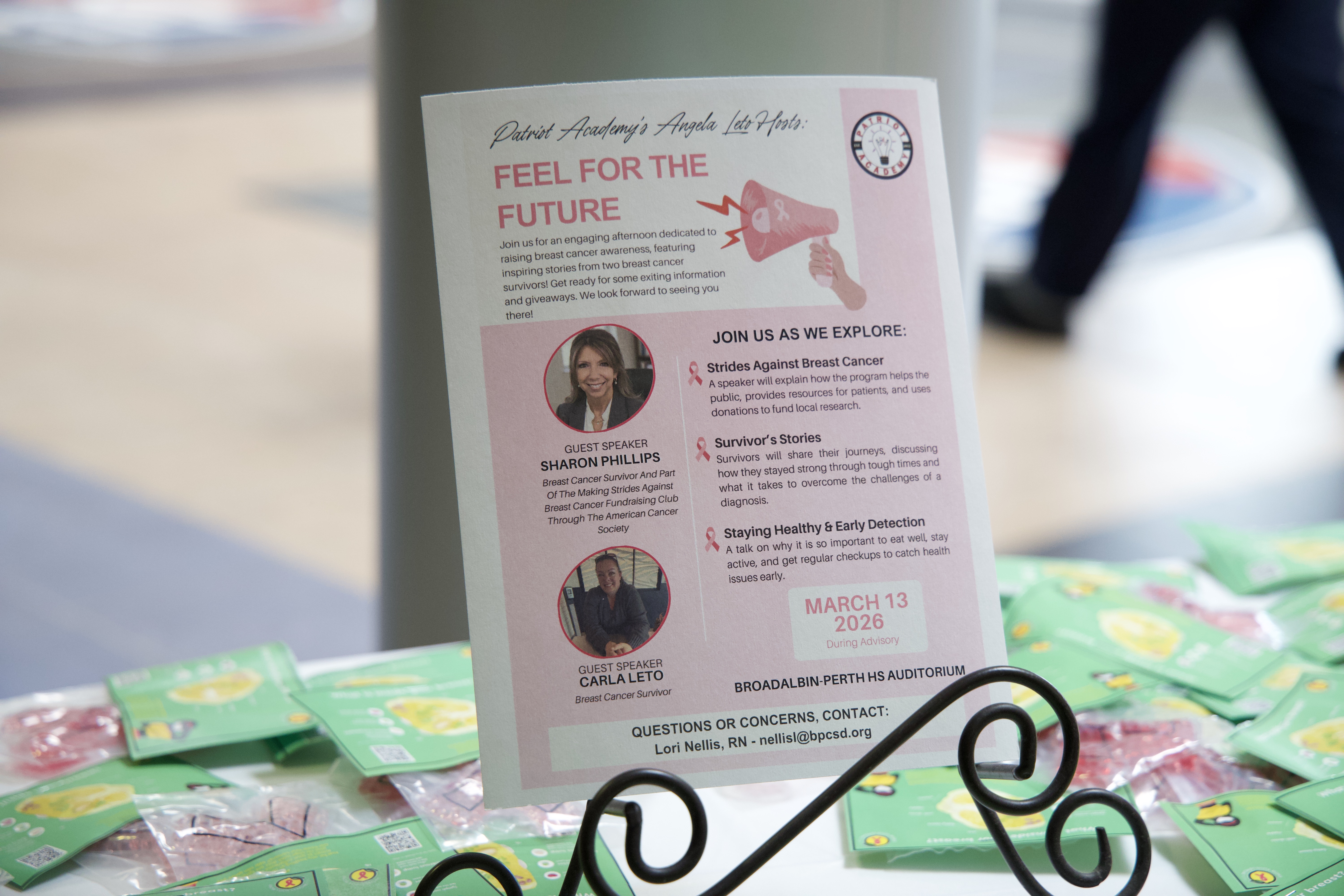 As part of the Patriot Academy program, senior Angela Leto hosted “Feel for the Future,” a breast cancer awareness event for girls in grades 7-12 in the high school auditorium. The program focused on the importance of early detection, healthy lifestyle choices, and understanding the resources available to individuals and families impacted by breast cancer.