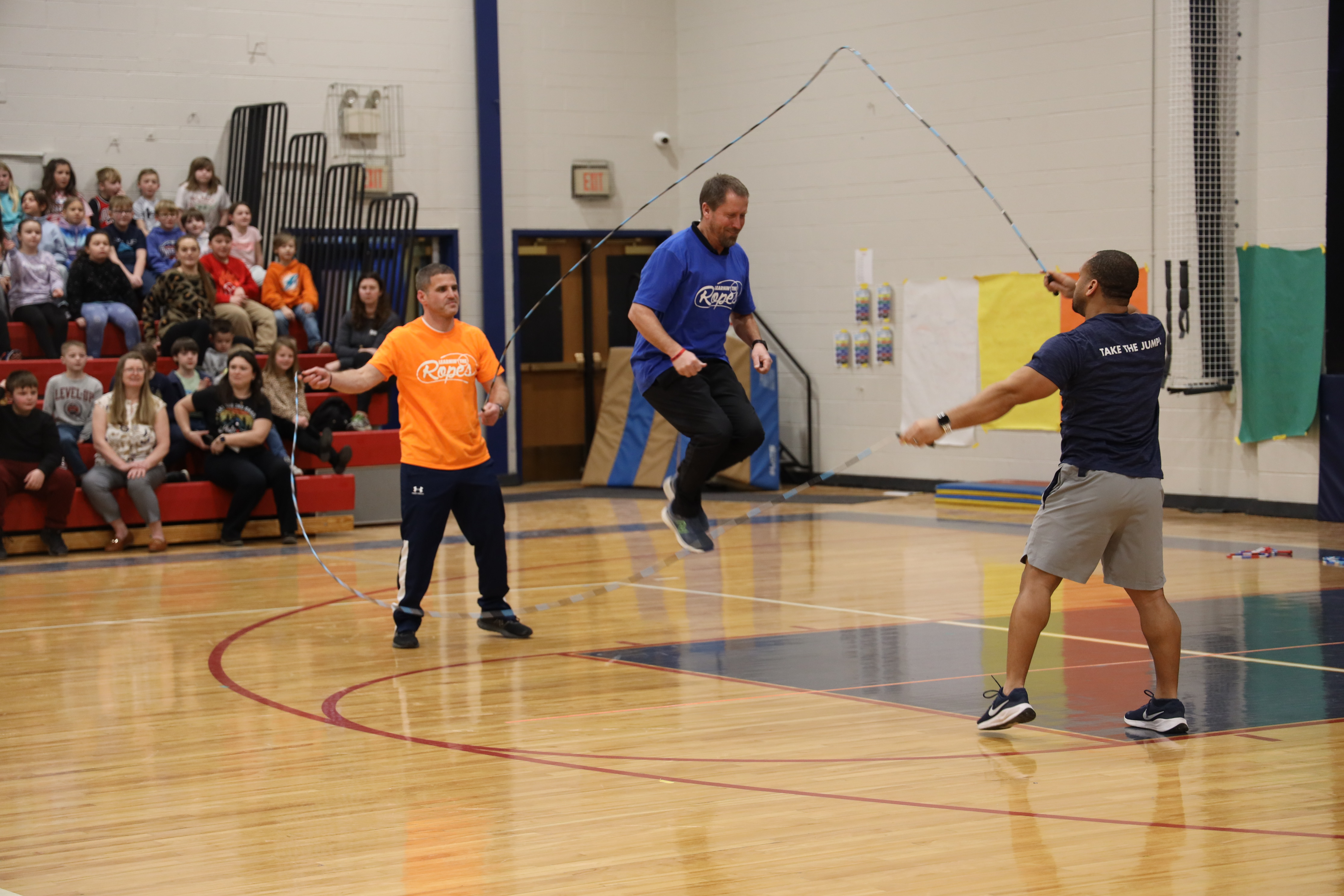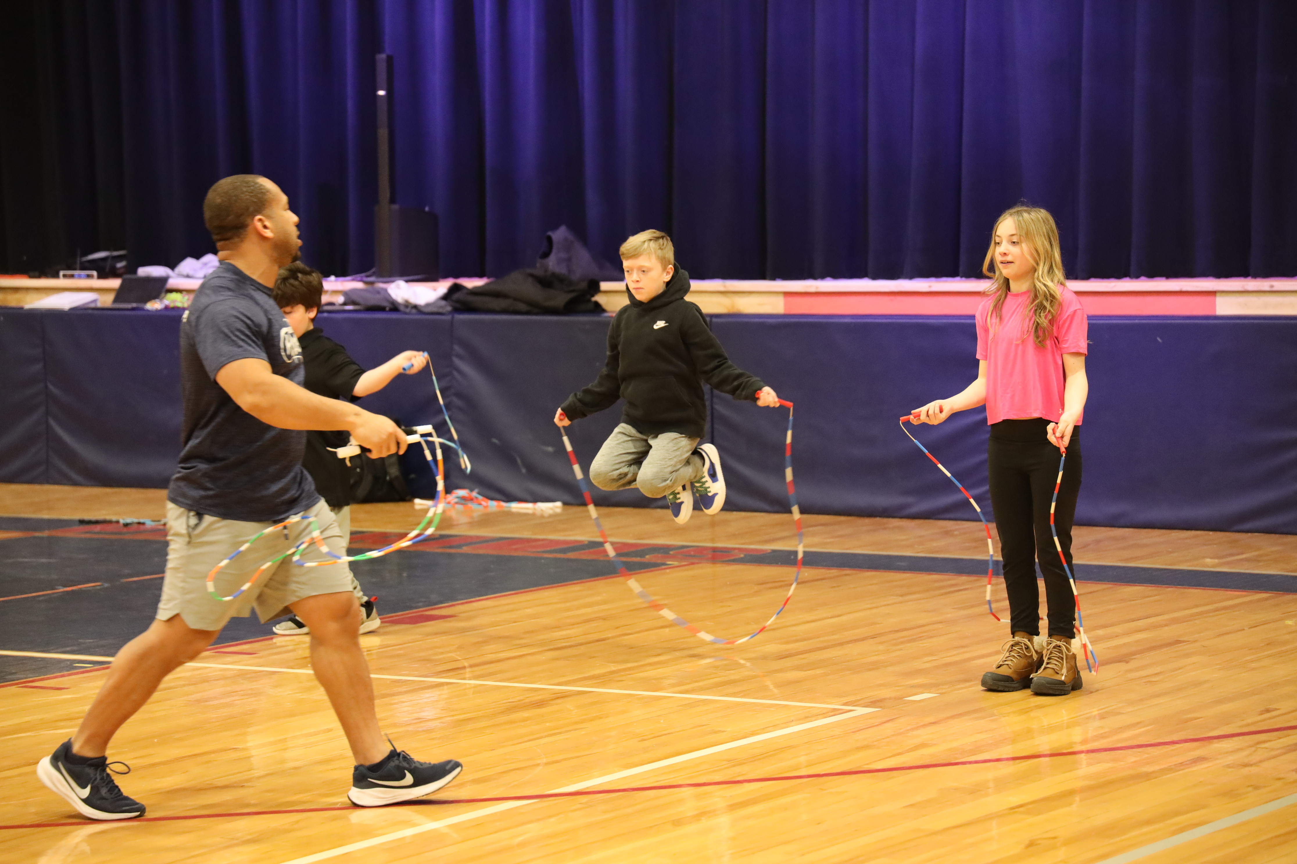 Woodard also called upon a few students to take the stage to practice their jump rope skills and show other students how it’s done. They were then taught how to do more complicated moves, like a jump rope push-up. After this, another group of students was invited to the floor to do double-dutch in front of the group. Students quickly caught on, making it look like an easy task.