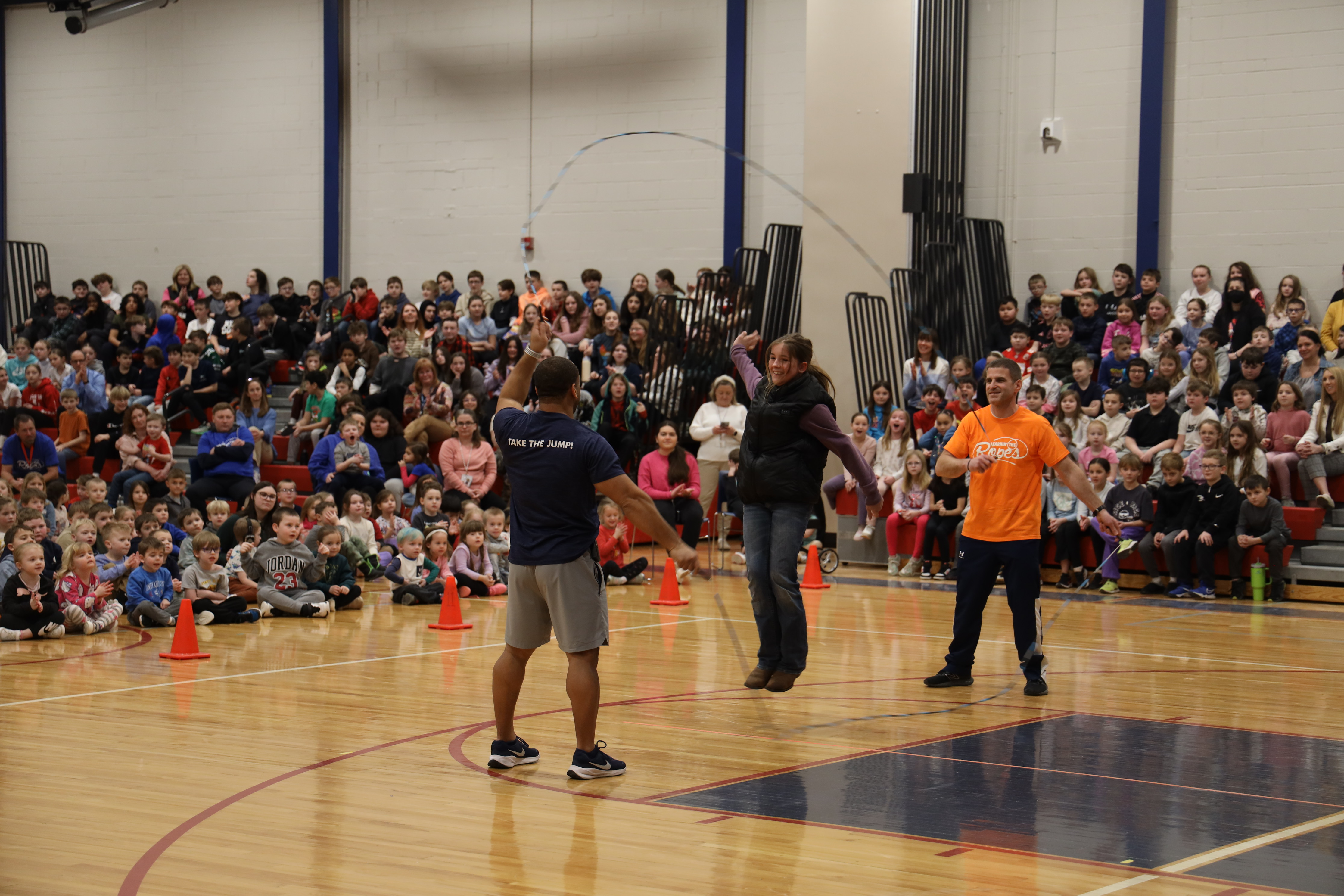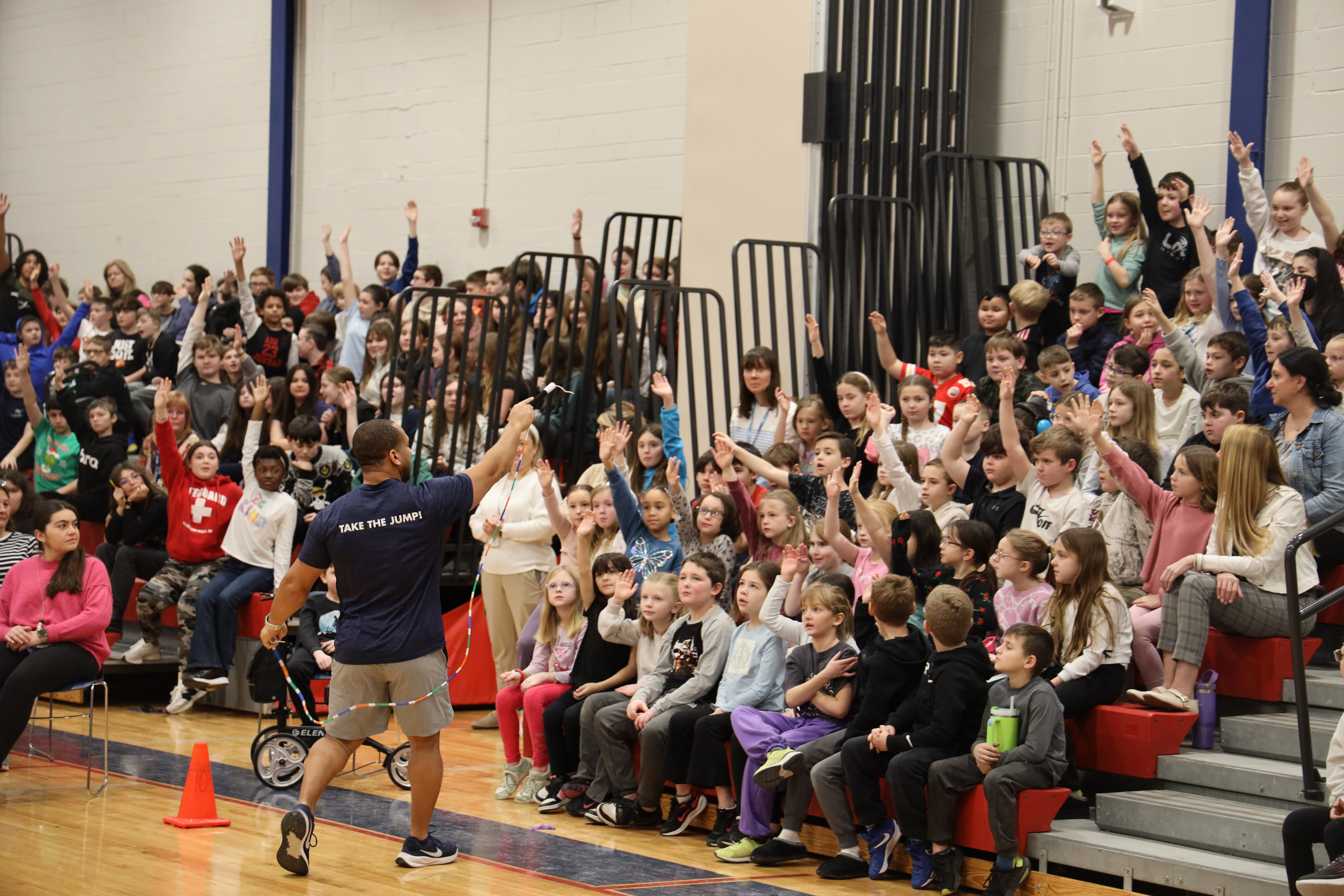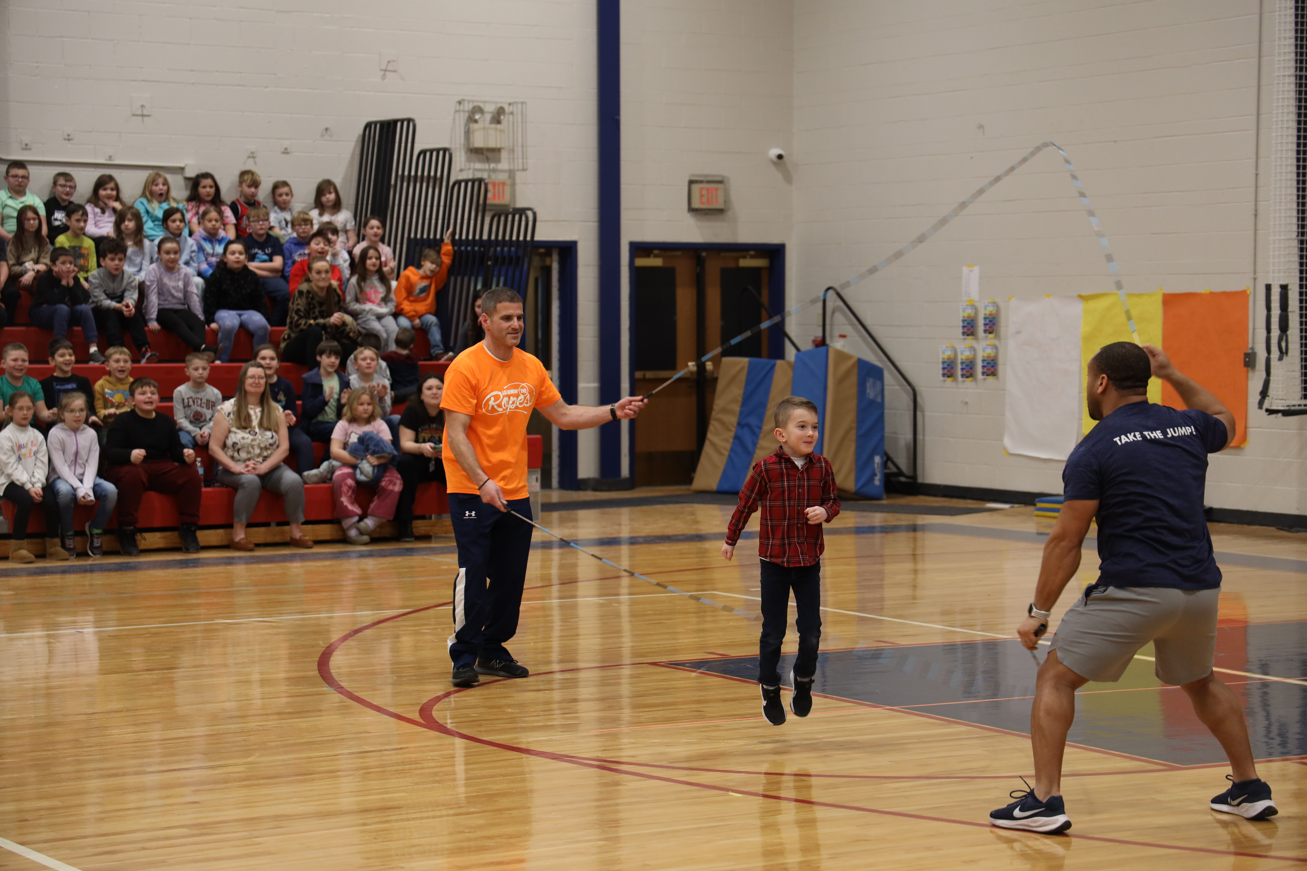 The assembly generated excitement around the Kids Heart Challenge, as Woodard showcased his jump rope talents. Woodard and his wife Kaylee have performed across the globe at a variety of venues and events, including NBA games, Cirque Du Soleil, schools, and summer camps. On Monday at BPES, Woodard started his presentation with a variety of jump rope stunts while also offering messages of encouragement and support to students at BPES.